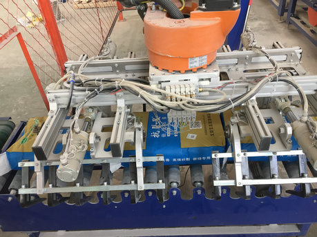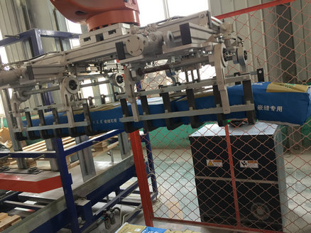 將產(chǎn)品通過(guò)進(jìn)料輸送帶輸送進(jìn)料,機(jī)器人及夾具到產(chǎn)品上方,抓取產(chǎn)品后移動(dòng)到棧板位,按事先輸入的碼垛形式進(jìn)行產(chǎn)品碼放,碼放完成后自動(dòng)輸送到纏繞工位,纏繞完成后叉車運(yùn)走。
