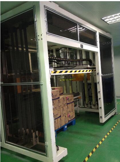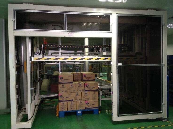 將產(chǎn)品通過(guò)進(jìn)料輸送帶輸送進(jìn)料,升降機(jī)移載著機(jī)械手夾具到產(chǎn)品上方,升降機(jī)構(gòu)下降抓取產(chǎn)品后平穩(wěn)上升,水平移動(dòng)到棧板位,按事先輸入的碼垛形式進(jìn)行產(chǎn)品碼放。碼垛裝置是依靠伺服電機(jī)和鏈條傳動(dòng)來(lái)同步運(yùn)行控制,確保產(chǎn)品碼放位置淮確。