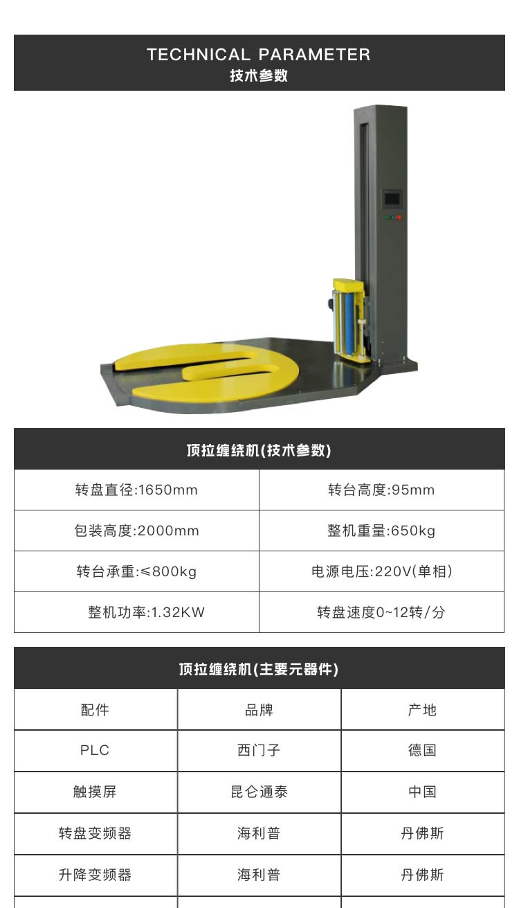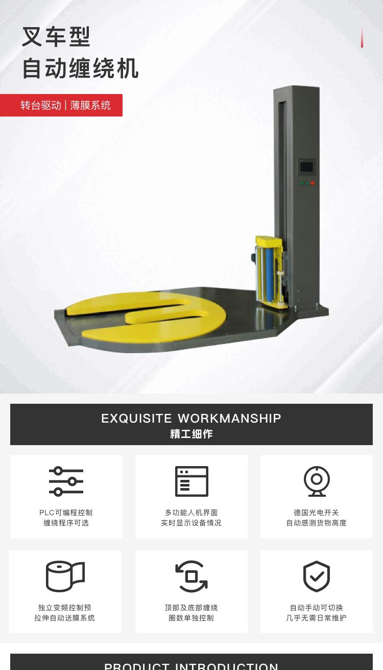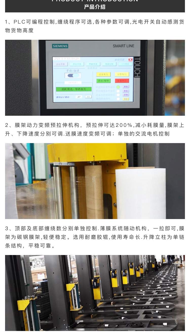 介紹:主要性能 PLC可編程控制,纏繞程序可選,各種參數可調, 光電開關自動感測貨物高度 預拉伸自動送膜機構 轉盤緩啟動、緩停止,自動復位 頂部及底部纏繞數分別單獨控制 自動、手動可切換,幾乎無需日常維護