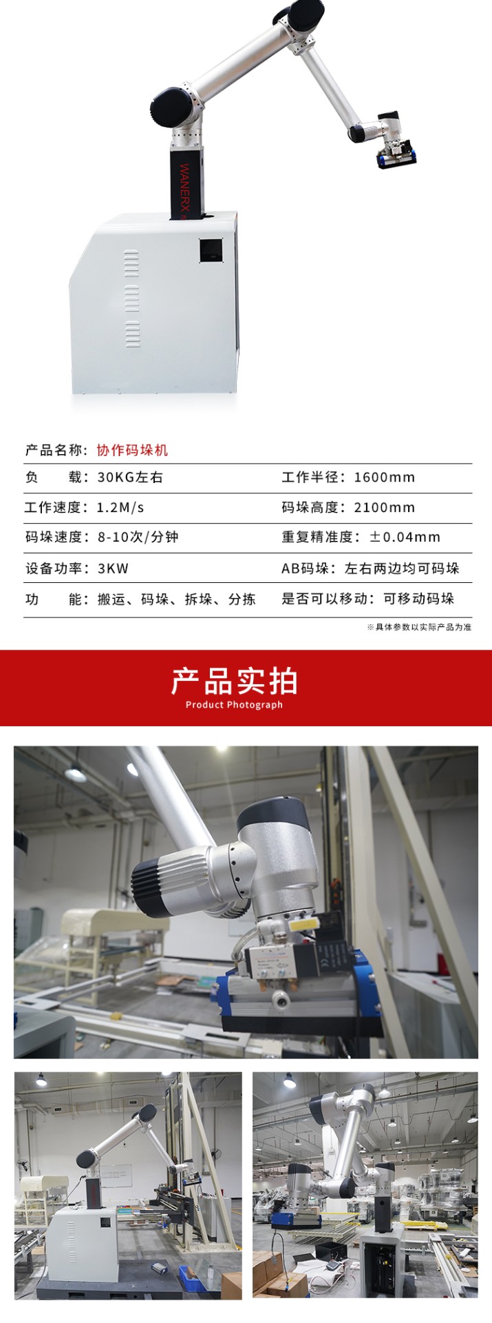 介紹:協(xié)作碼垛機器人是智能機器人,與人類工作人員緊密合作,提高生產(chǎn)效率、靈活適應(yīng)不同任務(wù)。配備傳感器,能自主學(xué)習(xí)、感知環(huán)境。廣泛應(yīng)用于紙箱、醫(yī)藥、食品等多個行業(yè)生產(chǎn)線。革命性提高生產(chǎn)線智能化程度,為工作人員創(chuàng)造更的工作環(huán)境。