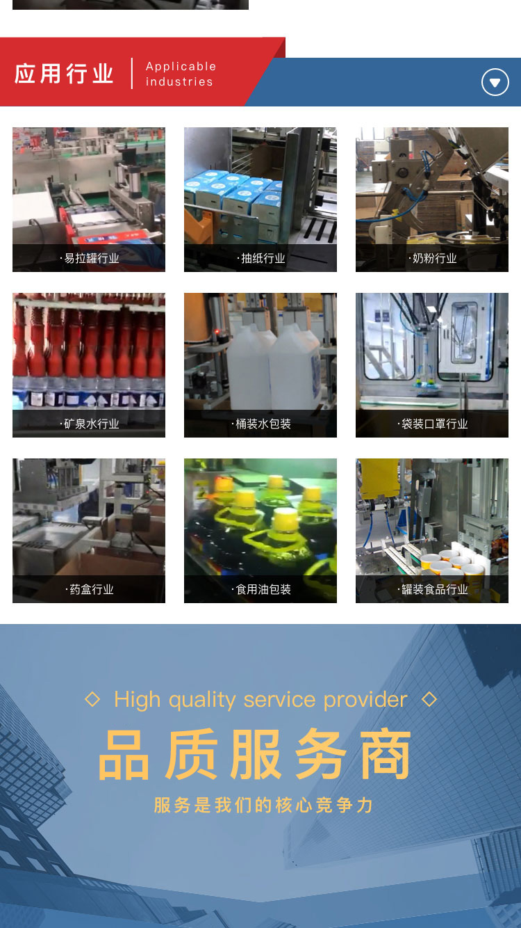 介紹:裝箱機(jī)是包裝機(jī)械的一種,有自動箱盒機(jī)、裝箱機(jī)等. 自動裝箱機(jī)是將藥瓶、藥板、藥膏等和說明書自動裝入折 疊紙盒中,并完成蓋盒動作。大屏幕可視面板獨立式按鈕七寸彩屏界面,簡單快捷,操作易懂單獨的按鈕設(shè)計,操作更簡單側(cè)推裝置結(jié)構(gòu)緊湊合理電器元件采用國內(nèi)品牌,性能穩(wěn)定將對疊好的抽紙推到箱子里。 專注后道包裝設(shè)備性能穩(wěn)定鑄就匠心品質(zhì),精工制造、支持訂制。 產(chǎn)品別稱:裝箱機(jī)、裝盒機(jī)、自動裝箱機(jī)、自動裝盒機(jī)、跌落式裝箱機(jī)、側(cè)推式裝箱機(jī)、抓舉式裝箱機(jī)、機(jī)器人裝箱機(jī)、一片式裹包機(jī)、藥盒裝箱。