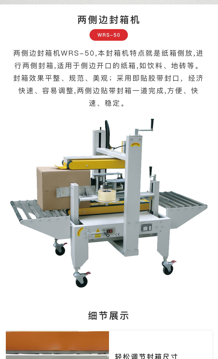 介紹:兩側(cè)邊封箱機(jī)WRS-50,本封箱機(jī)特點(diǎn)就是紙箱側(cè)放,進(jìn)行兩側(cè)封箱,適 用于側(cè)邊開(kāi)口的紙箱,如飲料、地磚等。封箱效果平整、規(guī)范、美觀;采用 即貼膠帶封口,經(jīng)濟(jì)快速、容易調(diào)整,兩側(cè)邊貼帶封箱一道完成,方便、 快速、穩(wěn)定。 產(chǎn)品別稱:全自動(dòng)封箱機(jī)、工字封箱機(jī)、一字封箱機(jī)、十字封箱機(jī)、四角邊封箱機(jī)、上下驅(qū)動(dòng)封箱機(jī)、左右驅(qū)動(dòng)封箱機(jī)、快遞封箱機(jī)、電商封箱機(jī)、膠帶封箱機(jī)、快速封箱機(jī)、可調(diào)封箱機(jī)、伺服封箱機(jī)